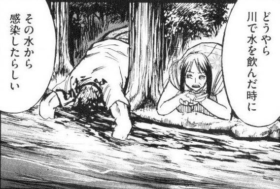 > > 川の水飲んでたら川上でうんこしてるのがあって